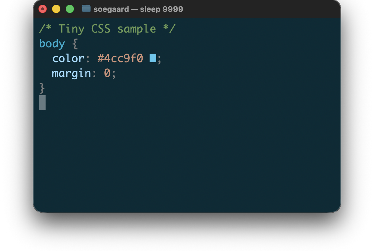 --–no-swatches disables CSS color swatches while keeping syntax coloring enabled.