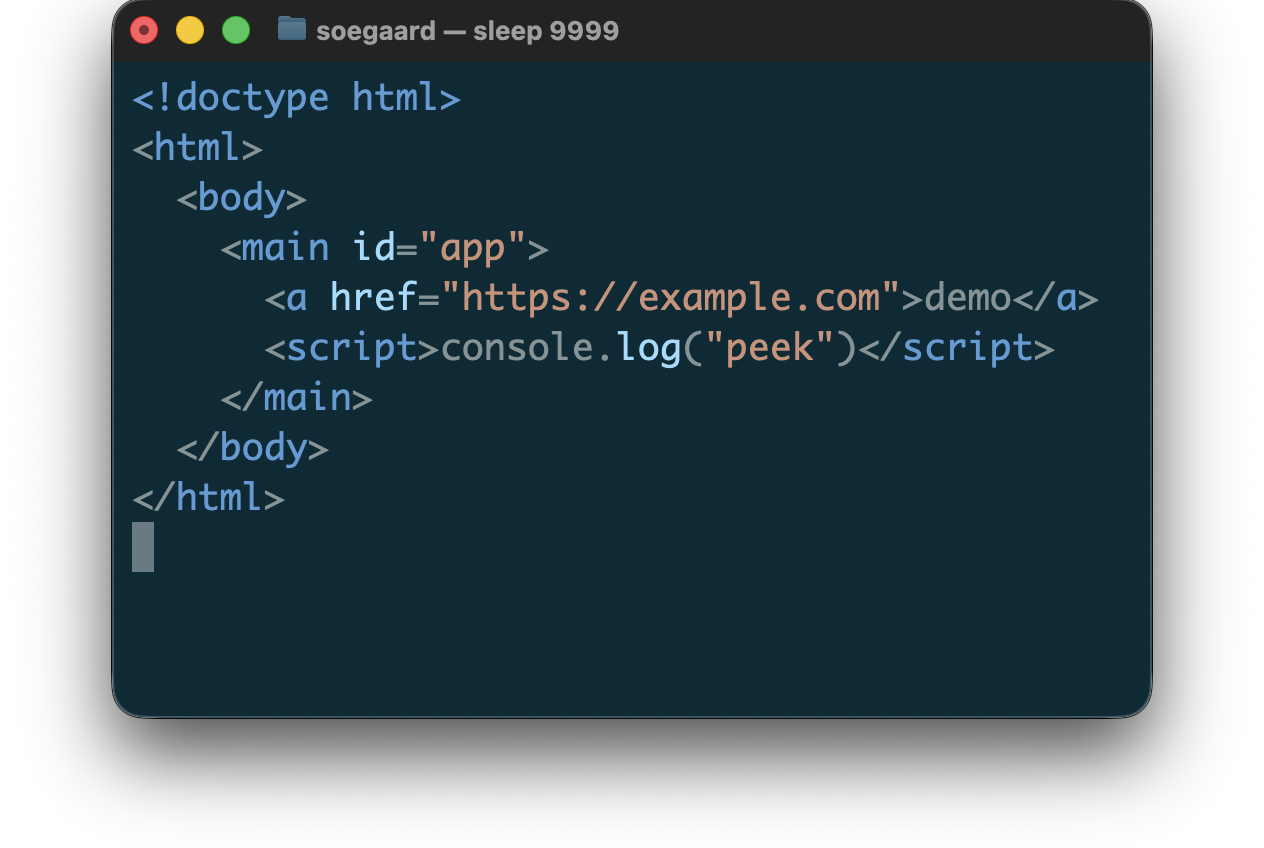 <!doctype html> <main id="app"> <style>.hero { color: #2f7ea0; }</style> <script>const root = document.querySelector("#app");</script> <p>Hello & goodbye.</p> </main>